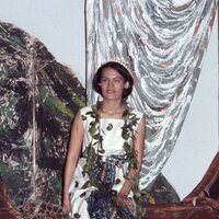 A performer wearing a white dress, sitting on a canoe set piece on stage at Pacific University's annual Lu'au in 1968.