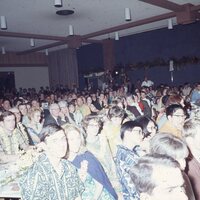 A wide view of the audience in attendance at Pacific University's annual Lu'au in 1968. Many of those present were students; others include the families of the Lu'au performers, university staff and local community members. Much of the audience is dressed for the occasion in colorful aloha shirts, muumuus, and leis. The remains of the kalua pig dinner that was served at each Lu'au are on the tables. This photograph was taken in Washburne Hall. The image is somewhat overexposed by the flash from the camera.