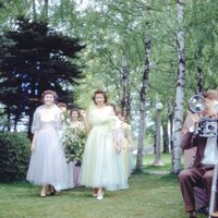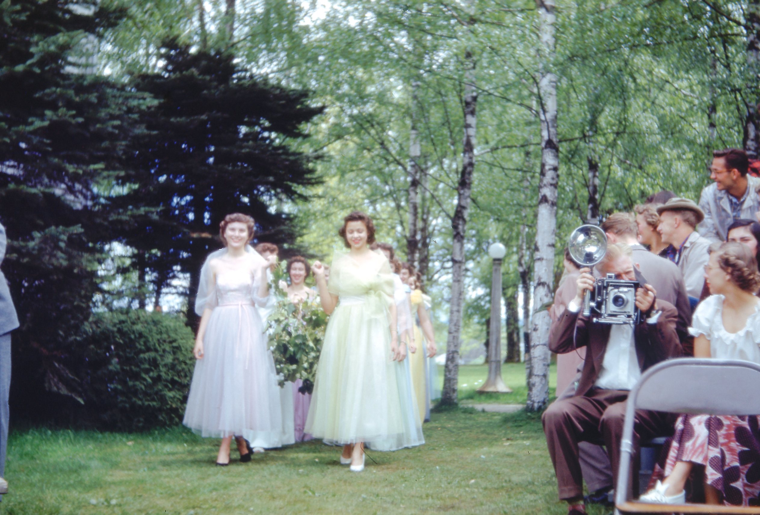 Women students in the "Queen's Court" in Pacific University's annual May Day celebration walk in a procession through campus in 1951. They are wearing pastel chiffon dresses and are carrying flowers and greenery, which was a part of the May Day tradition. Audience members, including what appears to be a professional photographer with a large camera, watch from the side. The trees in the background appear to be a part of the university's "Birch Walk," which was a line of trees planted in memory of students who died in service during World War II.
