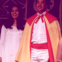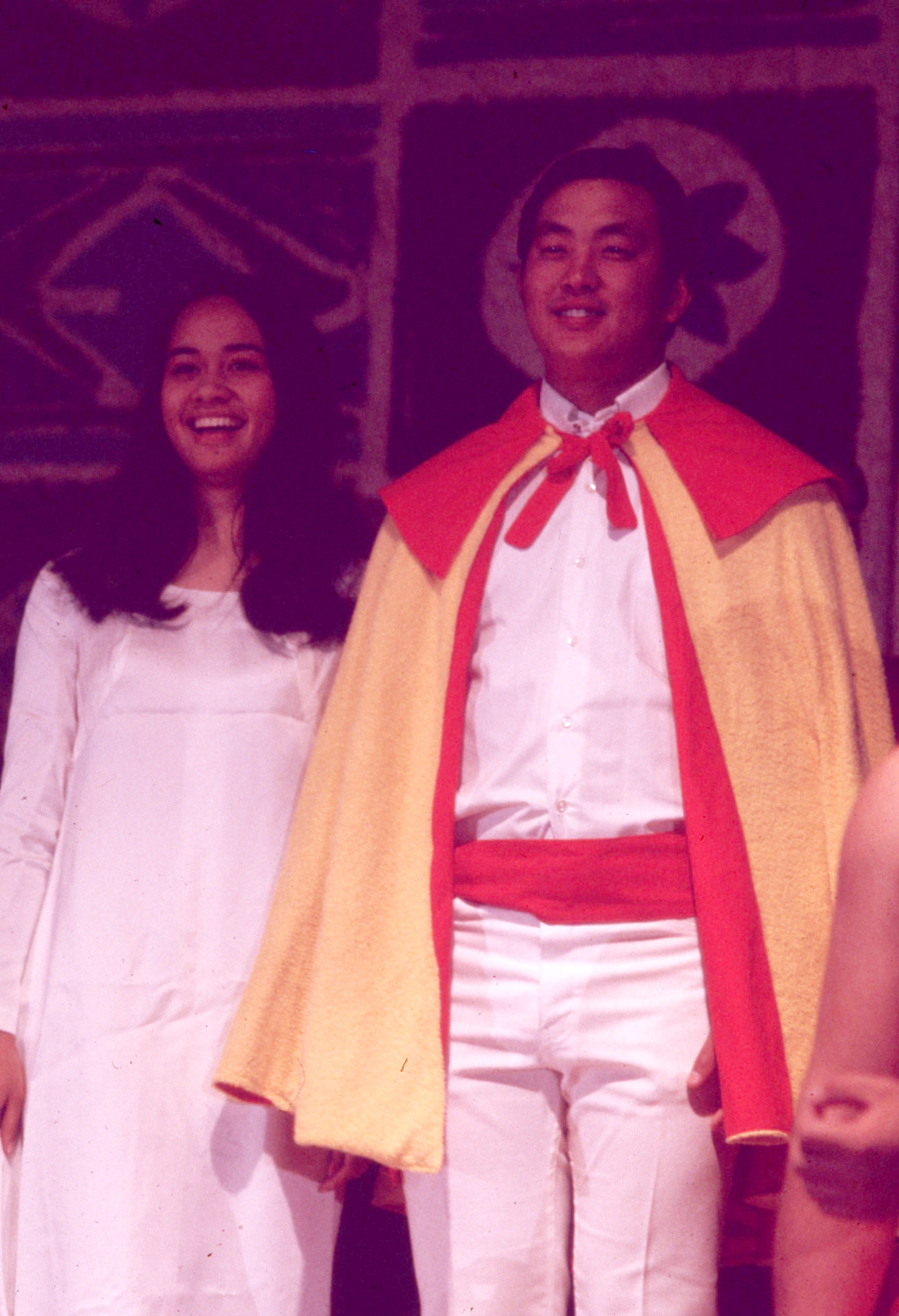 Two students performing as the "King and Queen" of Pacific University's annual Luau circa 1970-1972. Based on other images, the woman may be Millie Ah Ching. They are portraying members of the Luau's "Royal Court," in which several students representing the King (wearing a yellow cape) and Queen (wearing white) of Hawaii witnessed dances performed by Princesses (each wearing a different colored dress), who represented the various islands of Hawaii.