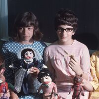 - Four children holding marionette puppets, probably at an event hosted by Pacific University. Based on other photographs that appear to be related, they may have been attending a puppet show held on campus in the Spring of 1968.