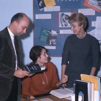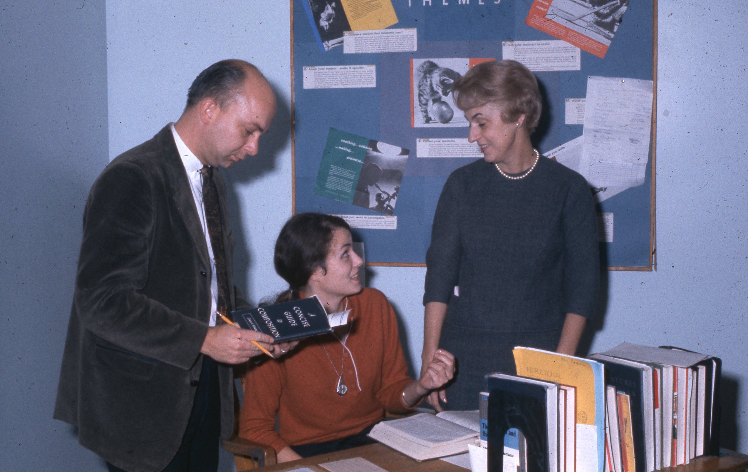 A Pacific University student sitting with books and two older adults who may be professors, circa the mid-to-late 1960s. One of the subjects is identified in a handwritten note on the original slide as "Jane [R--h?]."This photograph appears to have been posed, possibly for usage in a university publication. It may have been intended to illustrate literature studies at Pacific: the man holds a book titled "A Concise Guide to Composition," while posters on the bulletin board relate to writing "Themes".