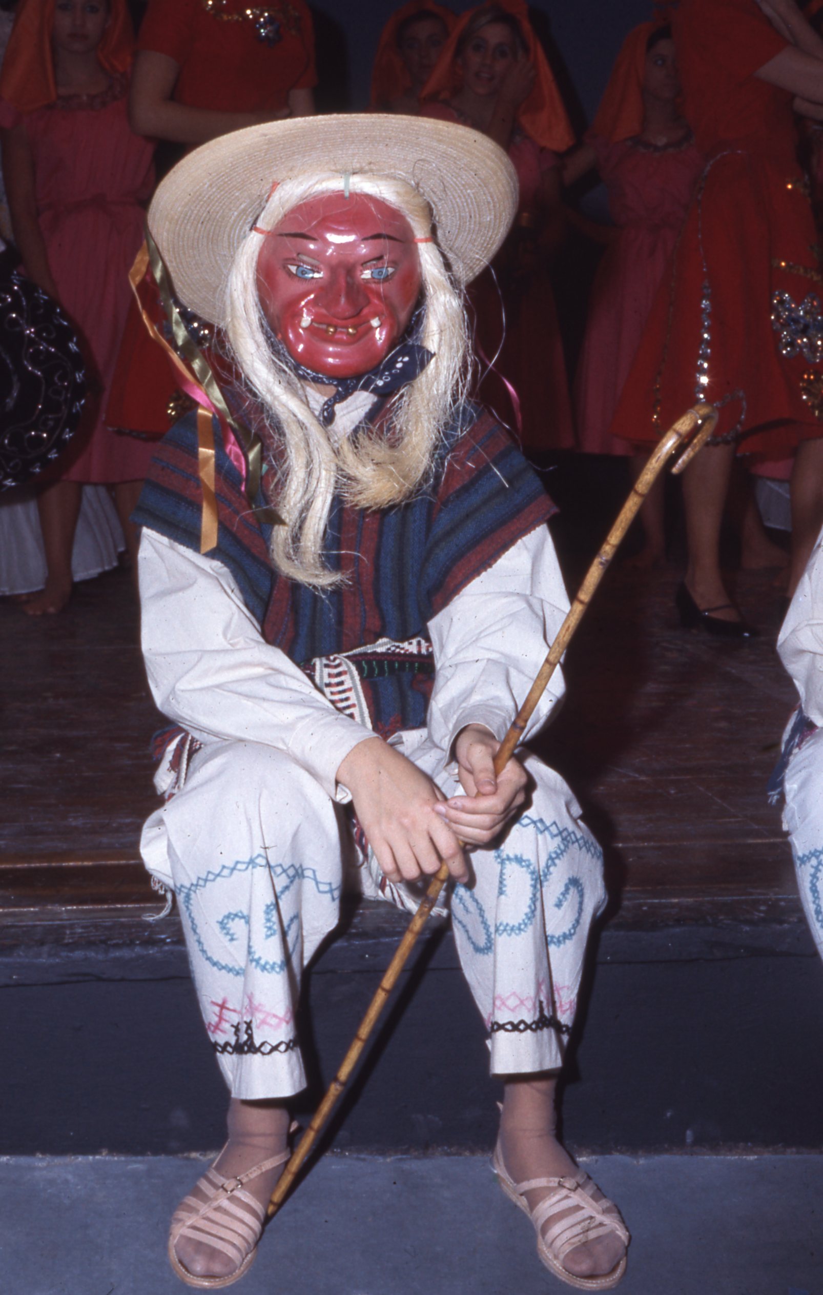 A Pacific University student wearing a mask and a costume, while other students in the background wear red dresses and head coverings. Based on other images that show the same costumes, this was likely taken at a performance of "The Royal Hunt of the Sun," which ran at Pacific's Tom Miles Theater in February-March, 1968. The actors, who were students at Pacific University, wore costumes inspired by Mexican folk dress. The plot centered on the conquest of the Incan Empire of Peru by the Spanish conquistador Pizarro. The slide was printed in November, 1968. For another view of the same student without the mask, see PUA_PeoSlides_044.