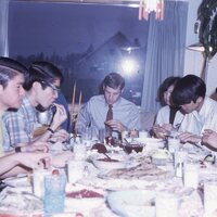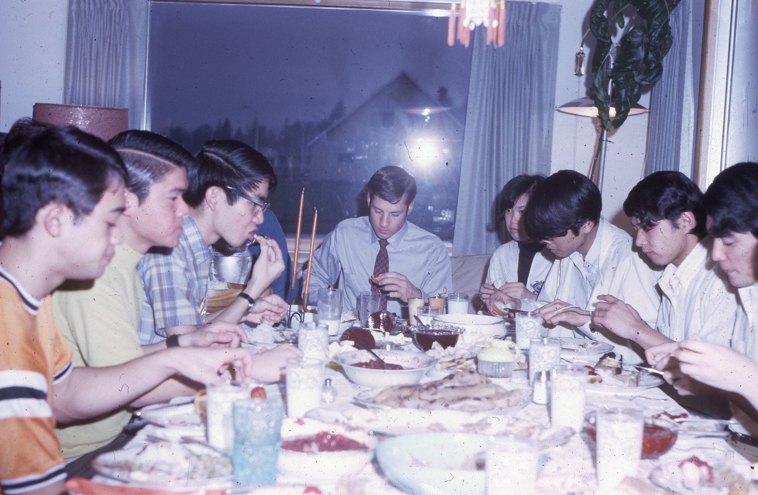 A group of Pacific University students, probably members of Haumana O Hawai'i (Hawaiian Club), eating Thanksgiving dinner in a private home. Cranberry sauce and other foods are visible on the table. Based on context from other related slides, this photograph was likely at the home of one of the club's advisors, Professor Fred Scheller: perhaps hosting students who lived far from Oregon and could not fly home for the holiday. His home was in Aloha, Oregon. The slide was printed in November, 1968.