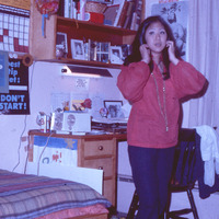 - Sharon Nonaka, a Pacific University student (Class of 1974), in her dorm room at Pacific in 1968 or 1969. Many posters and decor items are visible in the background. For a related image, see PUA_PeoSlides_048.