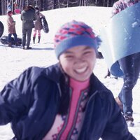 Pacific University student Cathy Chung (Class of 1973) on a Haumana O Hawai'i (Hawaiian Club) ski trip to Mount Hood in 1970. The woman on the right holding a mat whose head is outside of the frame is Kathleen "Casey" McAllister. Other people sledding with inner tubes and plastic saucers are visible in the background. The original slide was printed in March 1970.