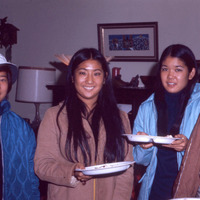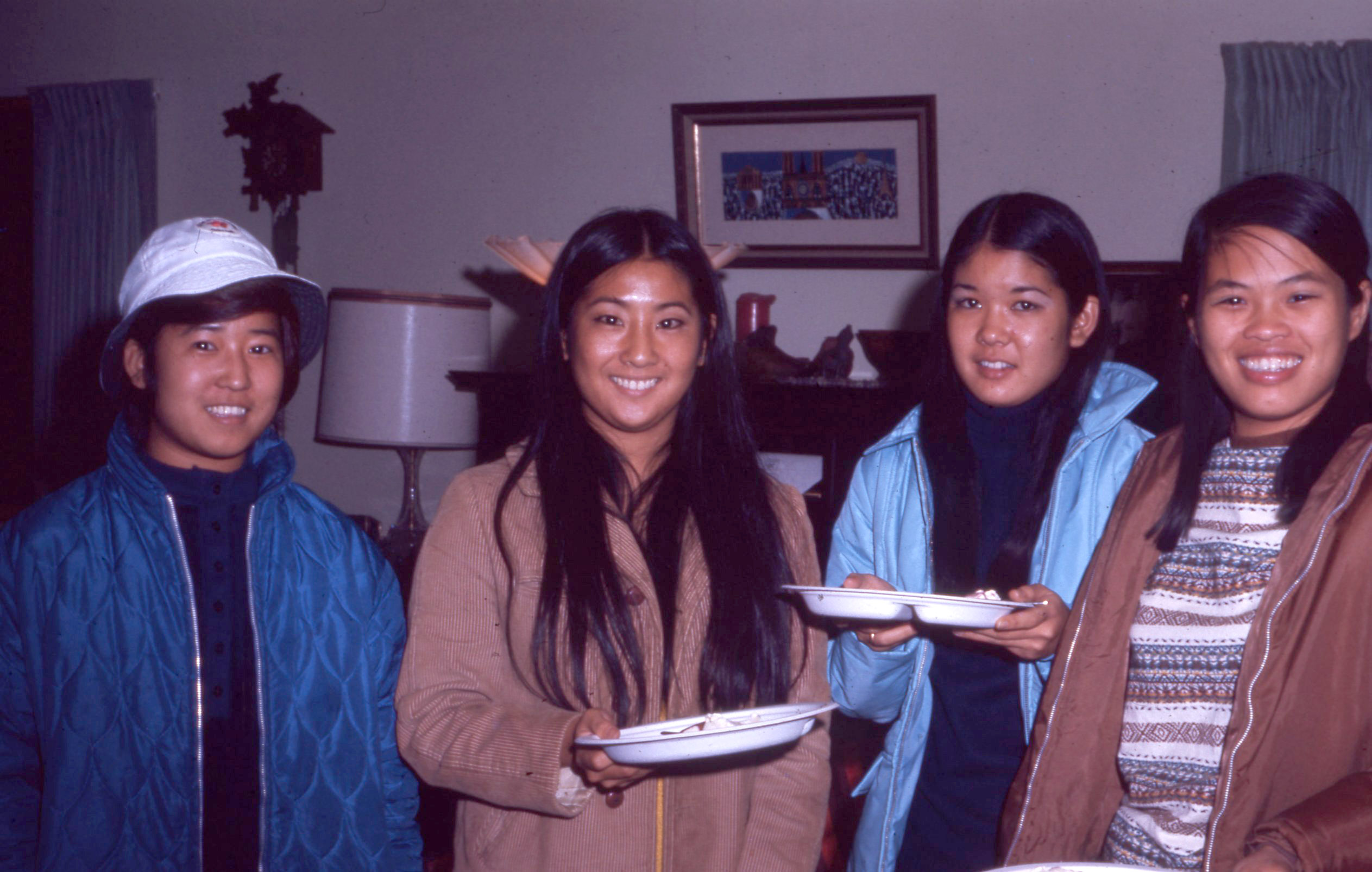 Student members of Pacific University's Haumana O Hawai'i (Hawaiian Club) attending a social event in a private home in the Fall of 1970. They are identified on the original slide from left-to-right as: Rene Akiyama; Sue Uyetake; Marge Teruya; and Sue Jan Chu. Based on other similar images, this event probably took place in the home of club advisor Professor Fred Scheller, who lived in Aloha, Oregon.