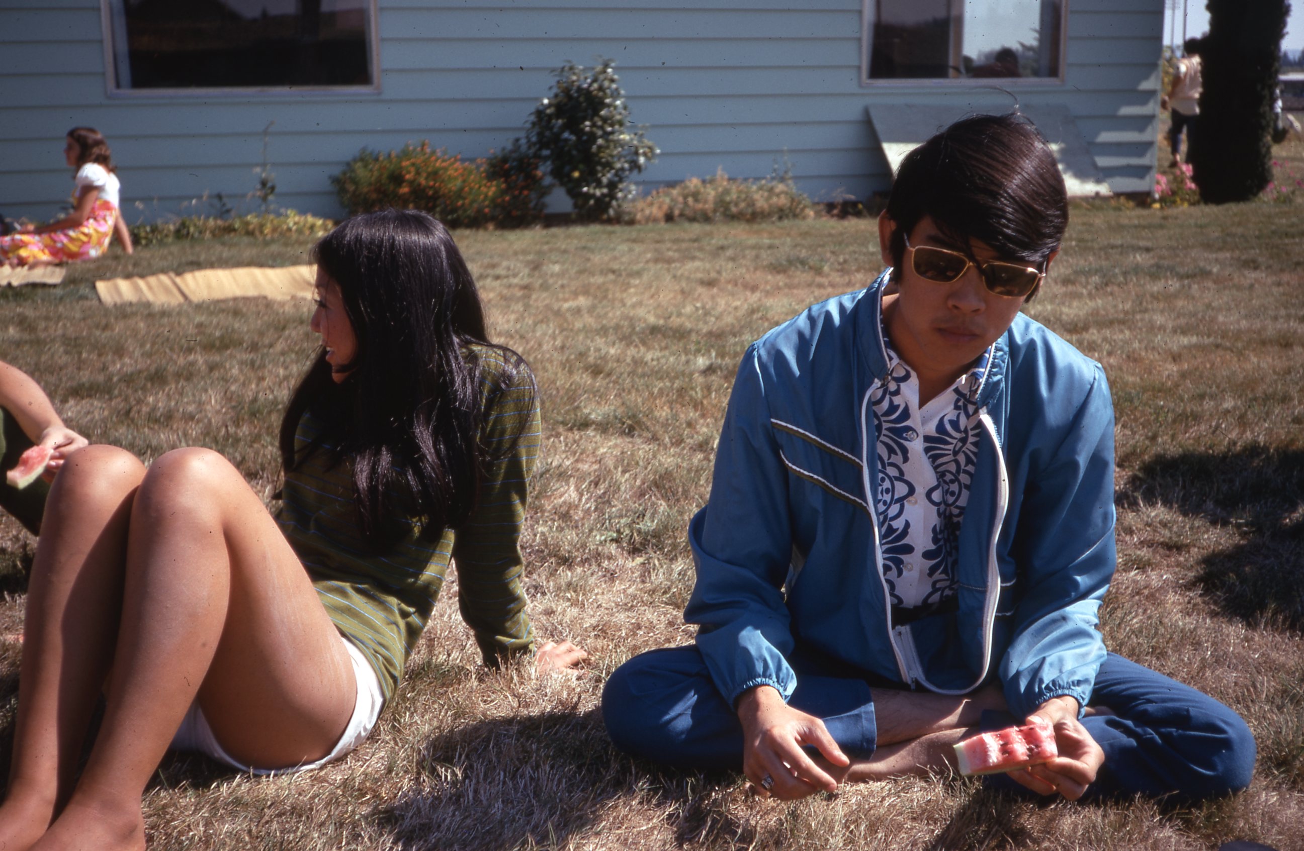 Pacific University students Sharon Nonaka (Class of 1974) and Roy Shimizu (Class of 1972) at a Haumana O Hawai'i (Hawaiian Club) event in the fall of 1970. They are relaxing in the sun while eating watermelon. This photograph was likely taken at the home of Professor Fred Scheller, who lived in Aloha, Oregon. Scheller was an advisor to Haumana O Hawai'i, and appears to have hosted many social events for Hawaiian students in his home around this time period.