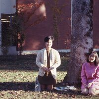 Students Anna Hisanaga (Class of 1972, wearing white) and Susan Kuioka (Class of 1972, wearing pink) sitting outdoors by Pacific University's Scott Library in the fall of 1970.