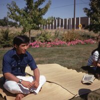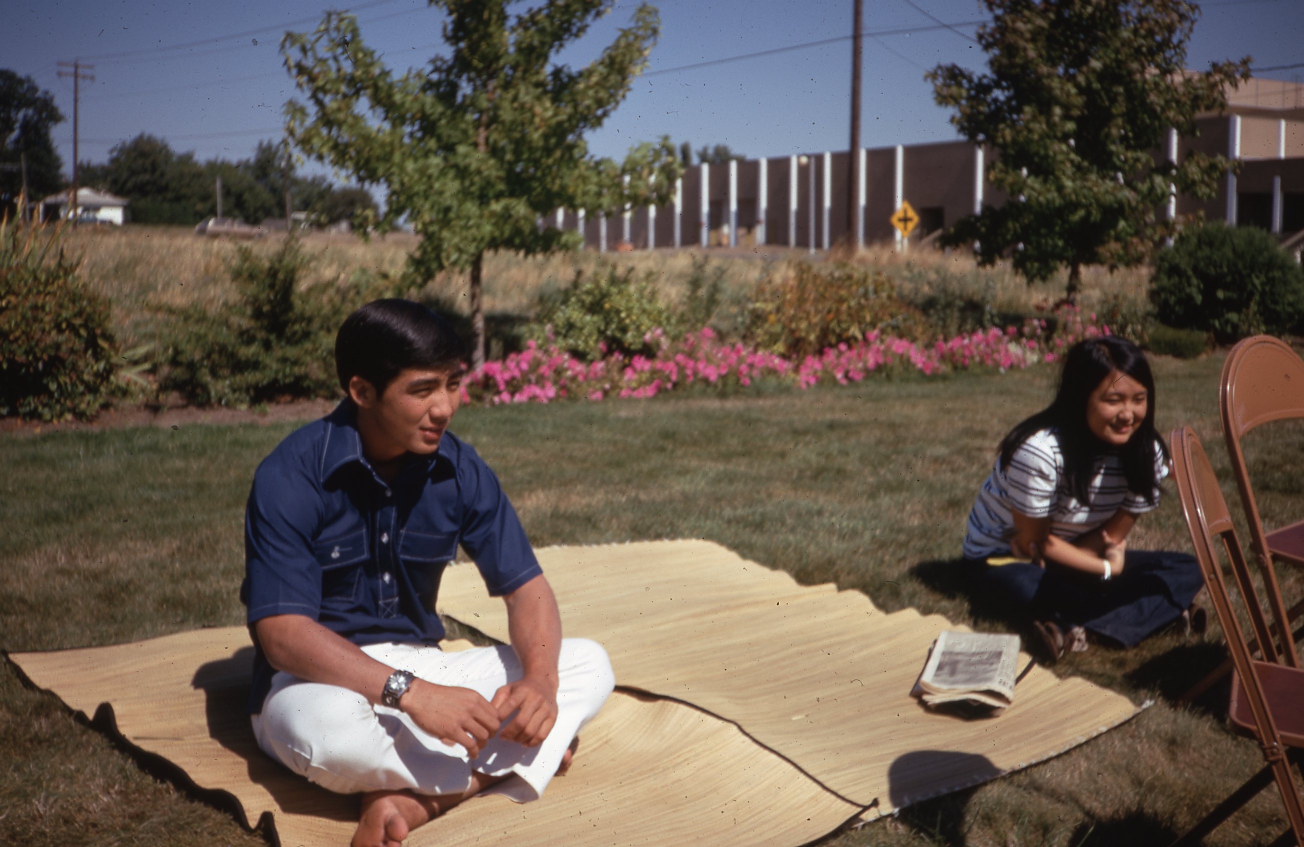 Pacific University students Sheldon Spencer (left) and Gayle Koyanagi (Class of 1974, right) at a Haumana O Hawai'i (Hawaiian Club) event in the fall of 1970. This photograph was likely taken at the home of Professor Fred Scheller, who lived in Aloha, Oregon. Scheller was an advisor to Haumana O Hawai'i, and appears to have hosted many social events for Hawaiian students around this time period.