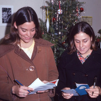 Christine Wyatt (Class of 1974) and another unidentified Pacific University student, holding air tickets from Pan Am, while standing in front of a Christmas tree. A caption on the original slide reads: "Chris Wyatt - Tickets for home." Based on context from other images in the set, these students were likely from Hawaii and were flying home for the holidays. This photograph was taken in December, 1970.