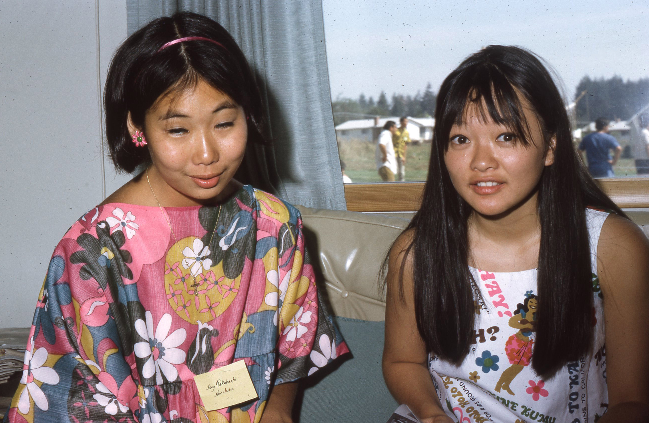 Joey Takahashi and another Pacific University student at a Haumana O Hawai'i (Hawaiian Club) social event, probably in October 1970. This photograph was likely taken at the home of Professor Fred Scheller, who lived in Aloha, Oregon. Scheller was an advisor to Haumana O Hawai'i, and appears to have hosted many social events for Hawaiian students around this time period. The original slide is labeled: "Haw. 1970."
