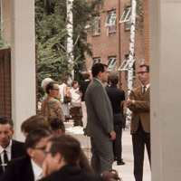 - People who appear to be faculty, students, and/or guests attending an event on the patio of Washburne Hall at Pacific University, circa 1970. Walter Hall appears in the background.