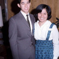 - Jill Matsui (Pacific University Class of 1972) with a friend, both dressed semi-formally, during an event at Pacific circa 1970. For two other images taken at the same event, see PUA_LuauSlides_275 and PUA_PeoSlides_111.