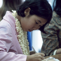 - Joey Takahashi, a member of Haumana O Hawai'i (Hawaiian Club) of Pacific University, wearing a lei made of small white flowers while writing. This photograph was likely taken circa 1970, at either one of the university's annual Lu'au celebrations, or at another performance organized by Haumana O Hawai'i.