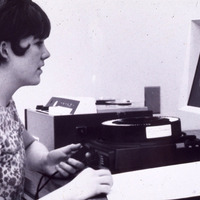 A Pacific University student examining what appears to be a slide for an art history class, using a mechanical slide viewer attached to a slide carousel. A reel-to-reel audio tape player is on the left. This photograph was likely taken circa 1970, and may have been posed for usage in university marketing publications. For another image of the same student, see PUA_PeoSlides_222.