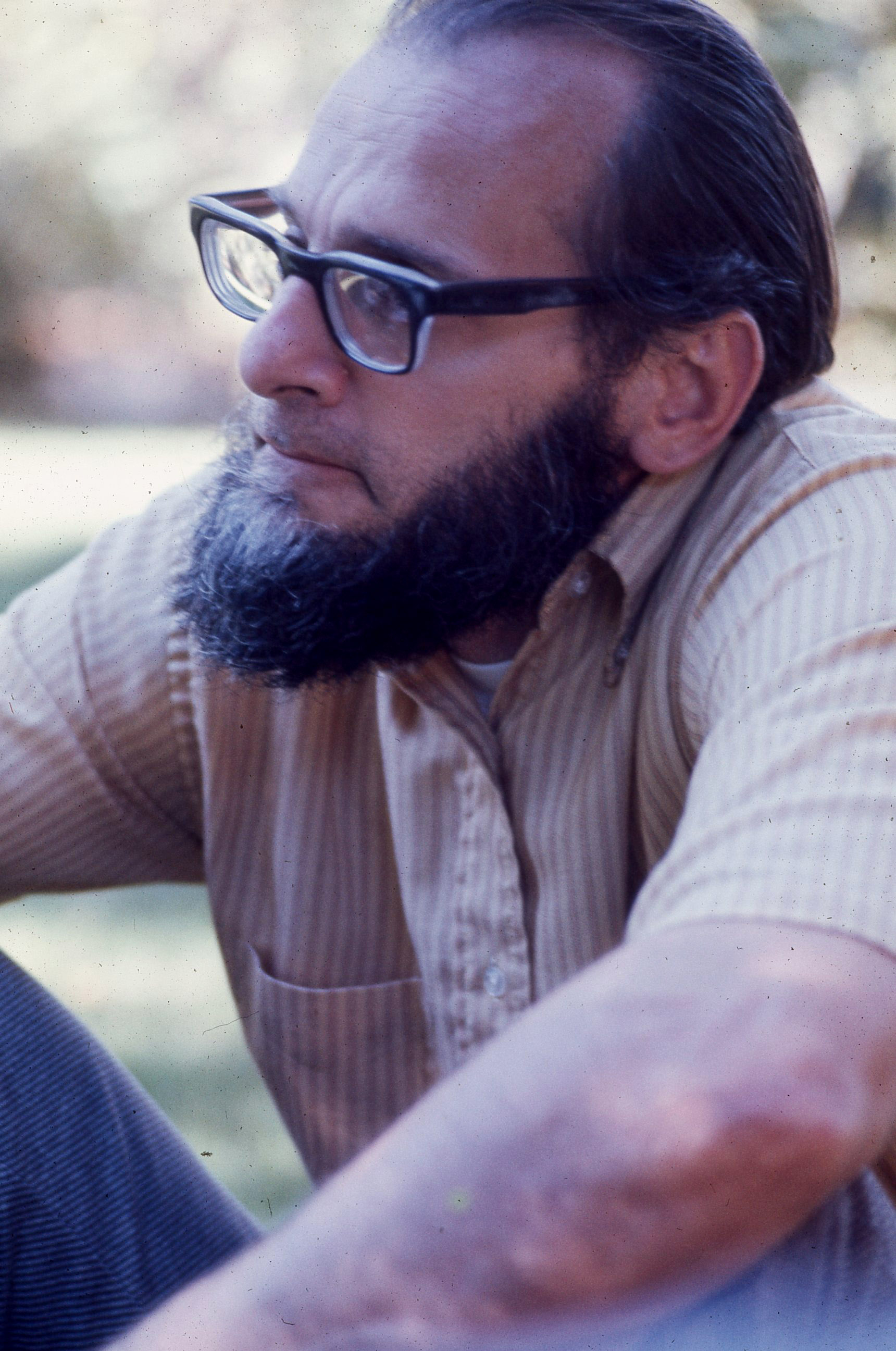 Pacific University professor Robert Davies, who taught English, conducting a class outdoors. This is one of a set of slides featuring students and faculty of Pacific University, apparently produced by a staff photographer circa 1970 for use in promotional publications. The photographer appears to have intentionally chosen subjects from diverse backgrounds to illustrate student experiences at Pacific. For another view of Davies and his class taken on the same day, see PUA_PeoSlides_143.