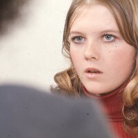 A close-up view of a female student's face while she attends a class. This is one of a set of slides featuring students and faculty of Pacific University, apparently produced by a staff photographer circa 1970-1974 for use in promotional publications. The photographer appears to have intentionally chosen subjects from diverse backgrounds to illustrate student experiences at Pacific.