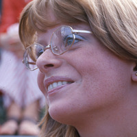 A close-up view of a Pacific University woman student with red hair and gold-rimmed glasses, smiling while sitting in a crowd outdoors. Based on other images that came from the same set, this may have been taken during a sports event. This is one of a set of slides featuring students and faculty of Pacific University, apparently produced by a staff photographer circa 1970-1974 for use in promotional publications. The photographer appears to have intentionally chosen subjects from diverse backgrounds to illustrate student experiences at Pacific.