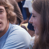 A close-up view of two Pacific University students, a man and a woman, smiling and talking while sitting in a crowd outdoors. Based on other images that came from the same set, this may have been taken during a sports event. This is one of a set of slides featuring students and faculty of Pacific University, apparently produced by a staff photographer circa 1972-1976 for use in promotional publications. The photographer appears to have intentionally chosen subjects from diverse backgrounds to illustrate student experiences at Pacific. This image was published in Pacific's annual "viewbook" in 1976; see: