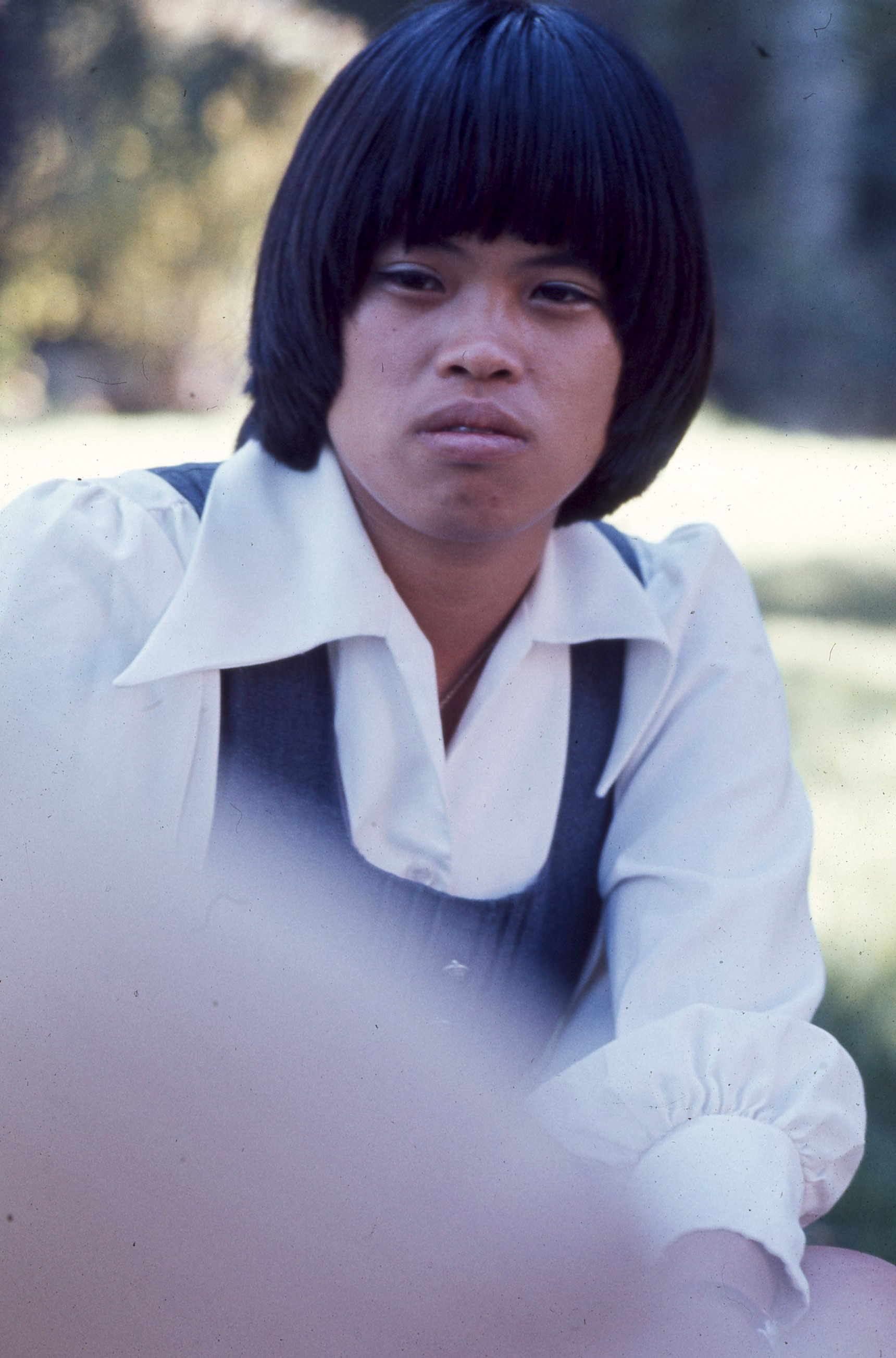 A student who appears to be Latino (but might be of another background), sitting outdoors on Pacific University's campus. Based on other images from the same set, this photograph was taken during an outdoor class session led by English professor Robert Davies. This is one of a set of slides featuring students and faculty of Pacific University, apparently produced by a staff photographer circa 1970 for use in promotional publications. The photographer appears to have intentionally chosen subjects from diverse backgrounds to illustrate student experiences at Pacific. For another view of this scene taken on the same day, see PUA_PeoSlides_143; for another view of this student, see PUA_PeoSlides_125.
