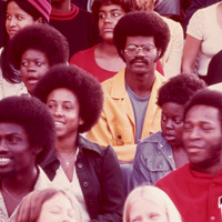 A group of mostly African American students from Pacific University, looking into the distance while seated on bleachers outdoors. Based on other images that came from the same set, this may have been taken during a sports event. This is one of a set of slides featuring students and faculty of Pacific University, apparently produced by a staff photographer circa 1970-1974 for use in promotional publications. The photographer appears to have intentionally chosen subjects from diverse backgrounds to illustrate student experiences at Pacific.