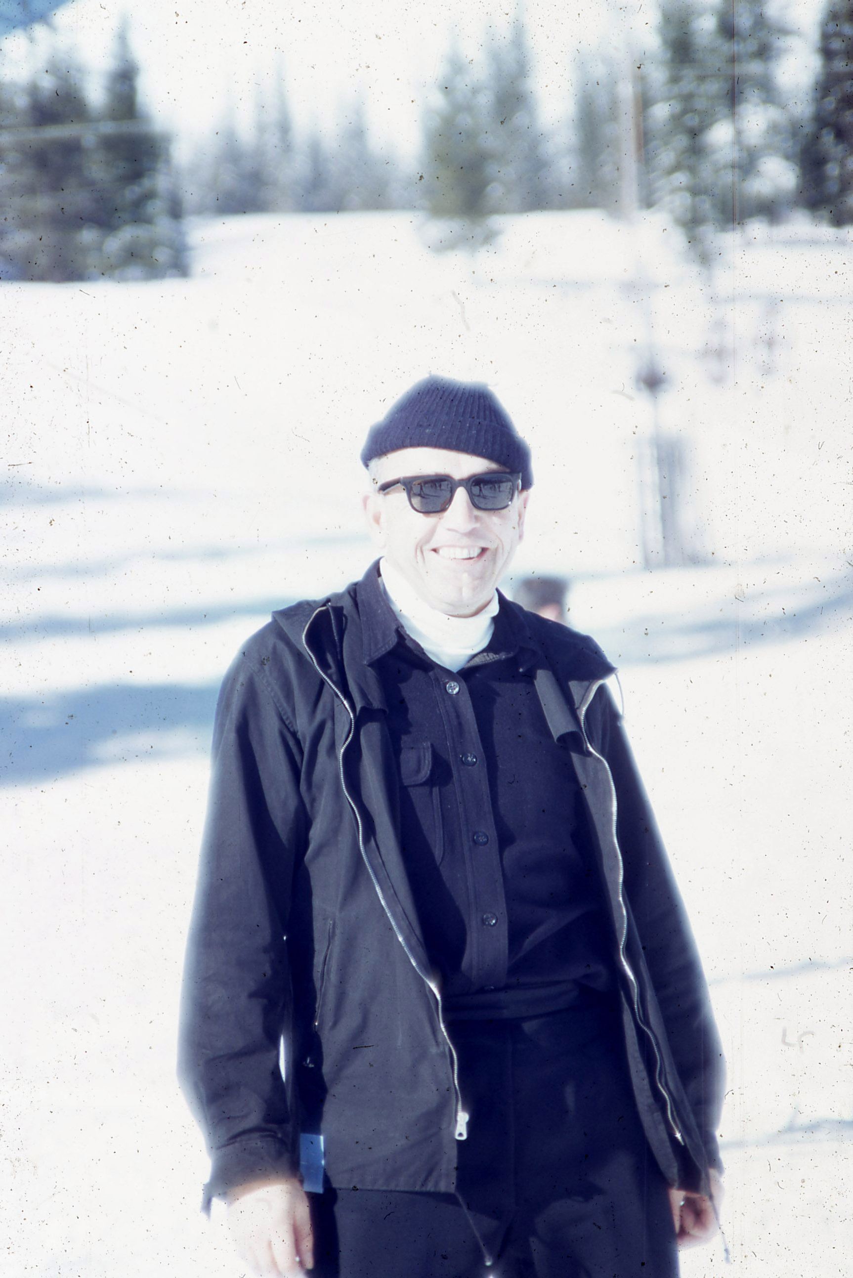 - Pacific University professor Fred Scheller on a ski trip to Mount Hood in February, 1971. This appears to have been part of an annual trip organized by Pacific's Haumana O Hawai'i (Hawaiian Club), led by Scheller. The original image is overexposed.