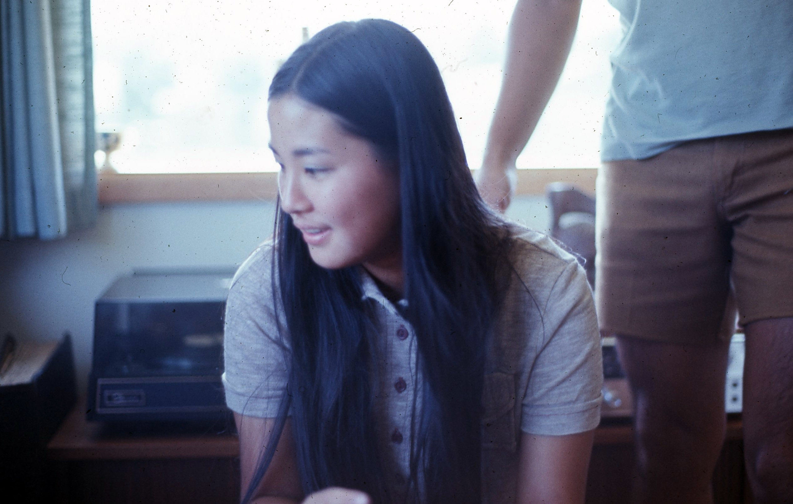 Pacific University student Annabel Ono (Class of 1975) at a Haumana O Hawai'i (Hawaiian Club) event in the fall of 1971. This photograph appears to have been taken at the home of Professor Fred Scheller. Scheller was an advisor to Haumana O Hawai'i, and hosted many social events for Hawaiian students in his home around this time period. The original slide was printed in November, 1971.