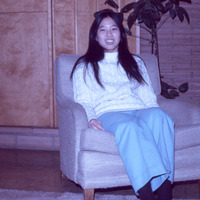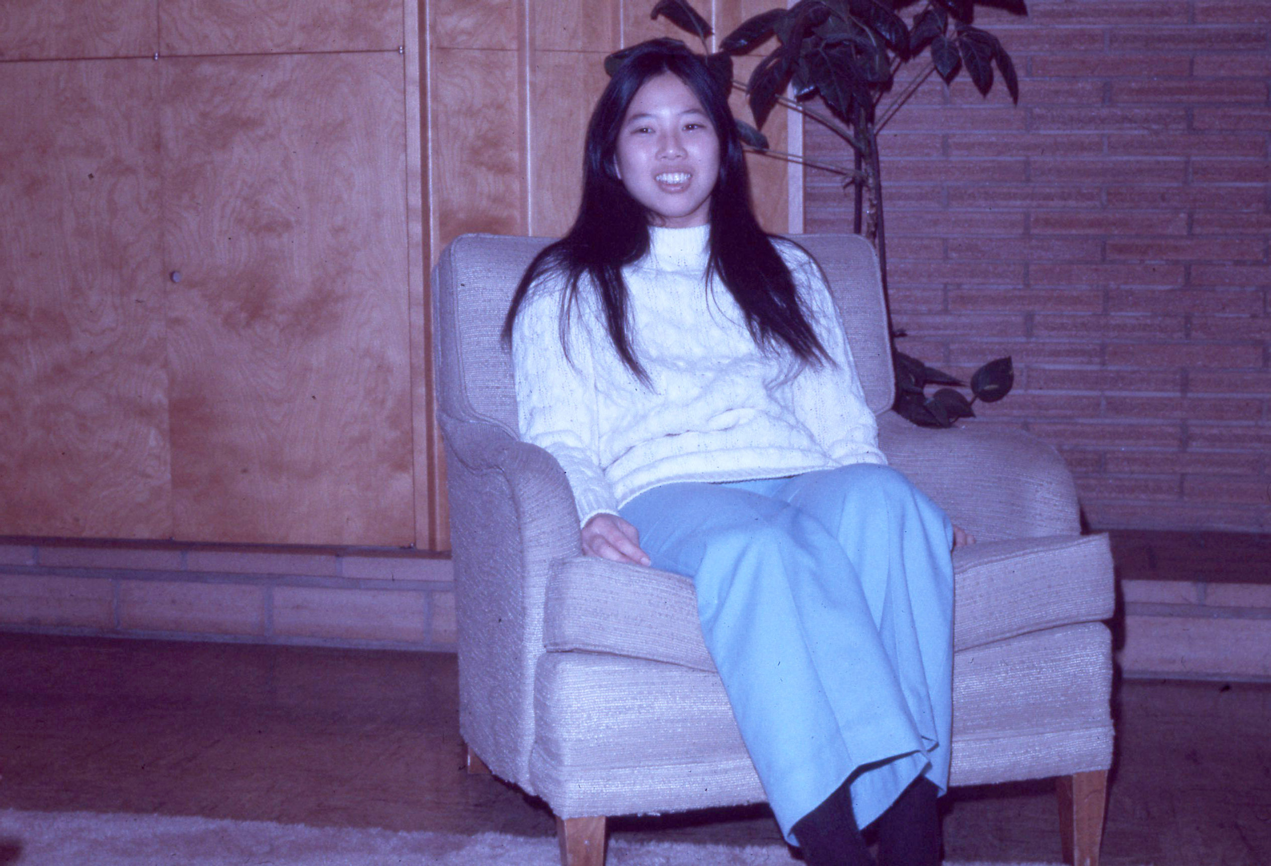 - A Pacific University student, identified on the original slide as Dee Ann Uchida (Class of 1975), sitting on an upholstered chair. She appears to be in the lounge of Walter Hall, which was a women's dormitory. The original slide was printed in December, 1971.