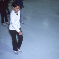 - A Pacific University student, identified on the original slide as Shirley Valdez, at an ice skating rink. This appears to have been taken during an outing of Haumana O Hawai'i (Hawaiian Students Club) in December 1971. It was most likely taken at the Beaverton Ice Center.