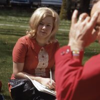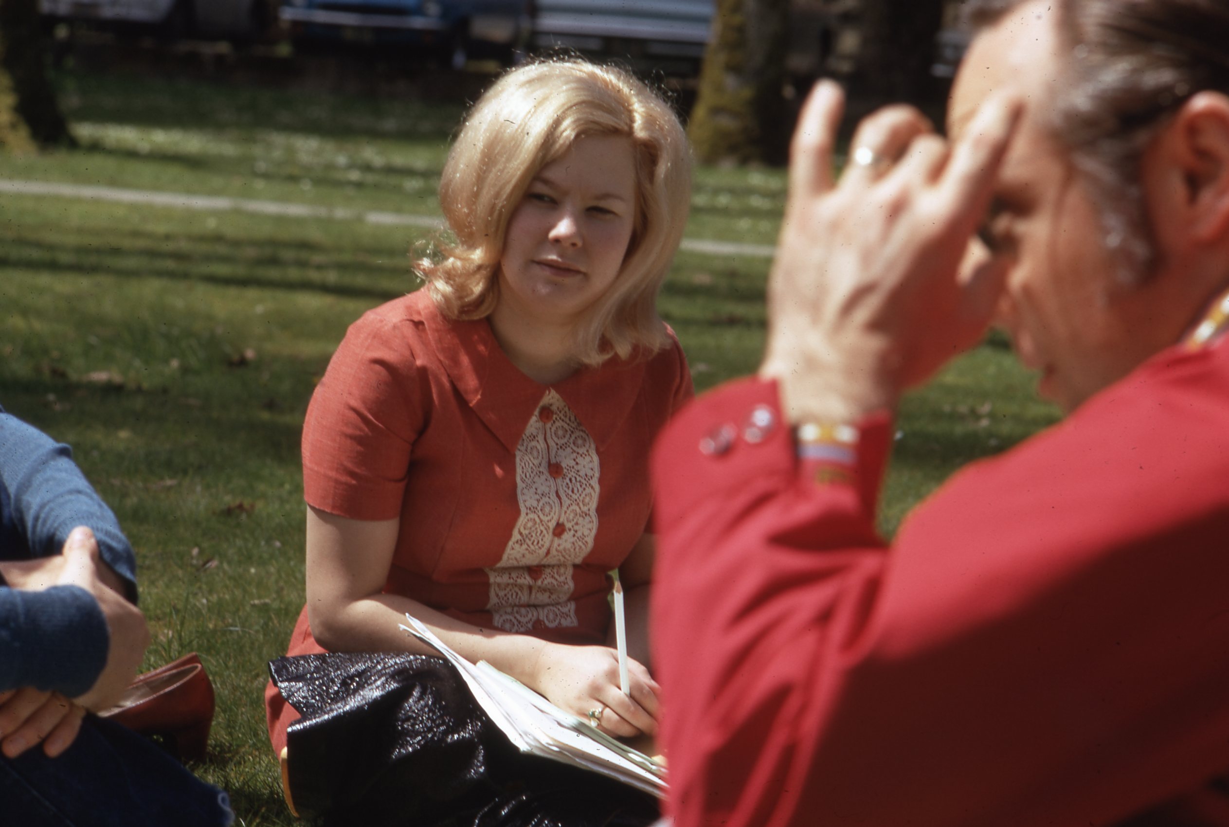 A student with blond hair sitting on the grass on the Pacific University campus, attending a class. She has papers and a pencil on her lap, while the professor is out of focus in the foreground. This photograph was taken by David Thompson, who may have been a staff photographer. The original slide was printed in May 1972.