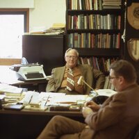 Two men, both presumably Pacific University professors, talking in an office on campus. The man sitting behind the desk appears to be Dr. Albert "Hap" Hingston, who taught Speech. A typewriter and many papers are spread across his desk, while a shelf packed with books appears behind him. This photograph was taken by David Thompson, who may have been a staff photographer. The original slide was printed in May 1972.
