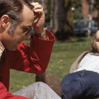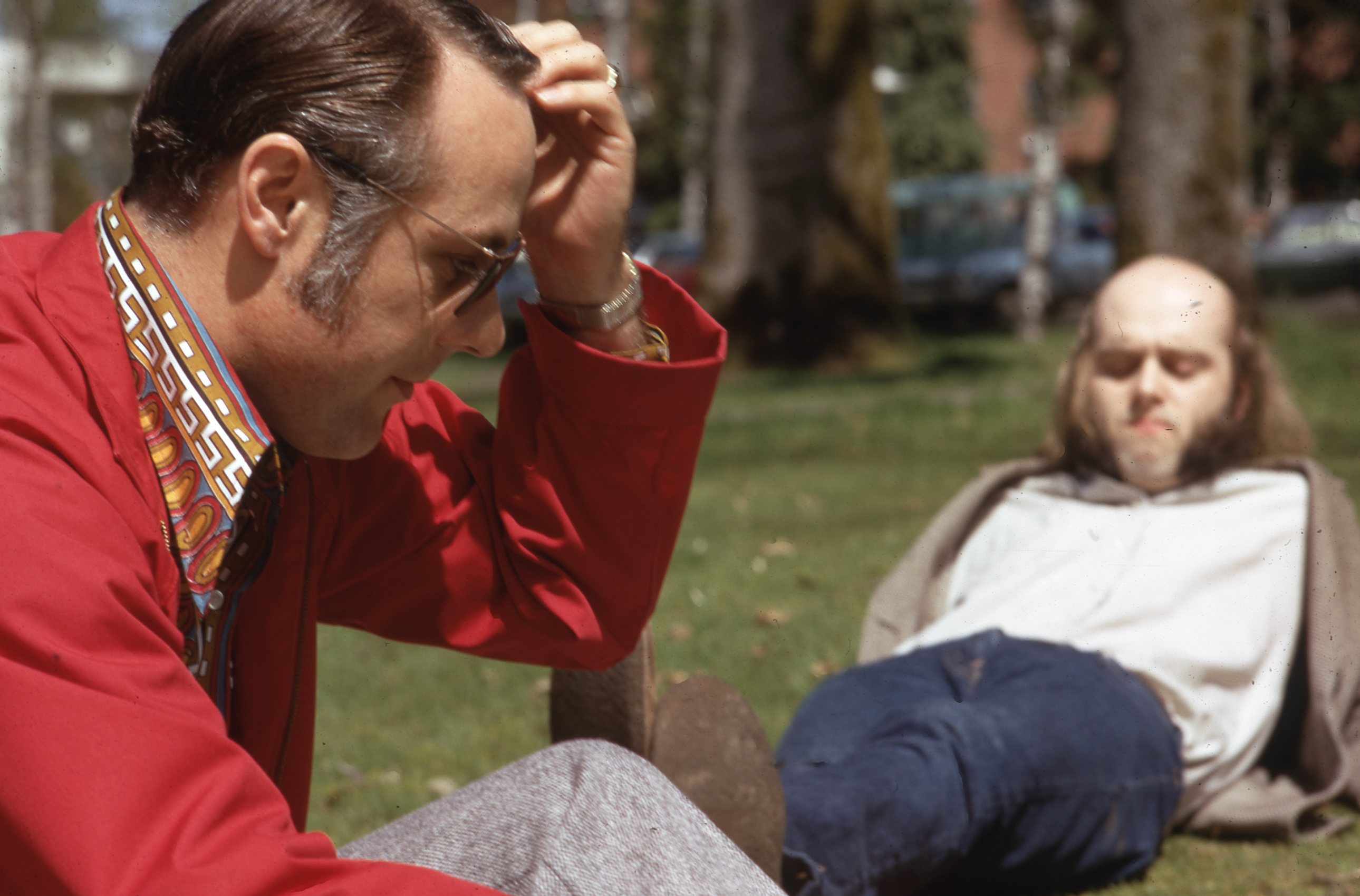 Two men sitting on the lawn of the Pacific University campus, most likely during a class being held outdoors. The man in the foreground is probably the professor; the man in the background may be a student. This photograph was taken by David Thompson, who may have been a staff photographer. The original slide was printed in May 1972.