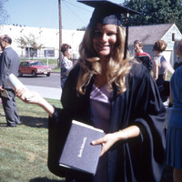 - A female student dressed in a graduation robe and holding her diploma, just after Commencement in May, 1973.