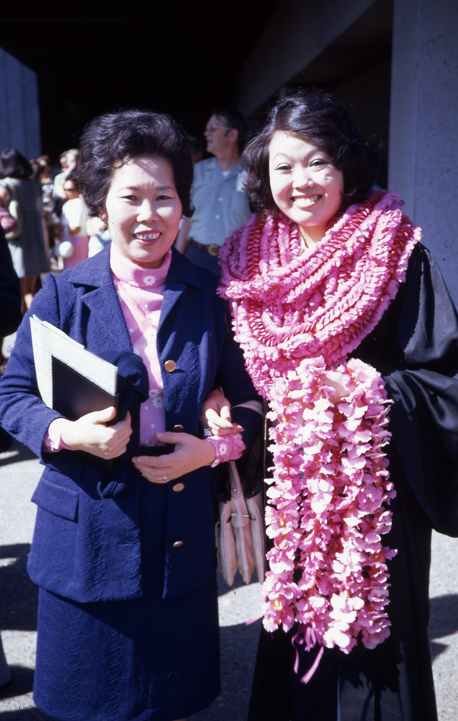 - Student Faith Nagasawa dressed in a graduation robe wearing a large number of pink leis, just after Pacific University's Commencement in May, 1973. The woman standing with her is likely a relative; possibly her mother.