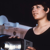 A Pacific University student operating a projector, which has a stencil marked "PU AV" (Pacific University Audio-Visual). The image appears to have been taken during an event in the gym: a basketball hoop is visible in the background. This photograph was probably taken by a staff photographer to illustrate student experiences, possibly for use in a promotional publication. The slide was printed in March 1976, but is probably a reprint of an earlier photograph, most likely taken circa 1970. For another image of the same student, see PUA_PeoSlides_119.