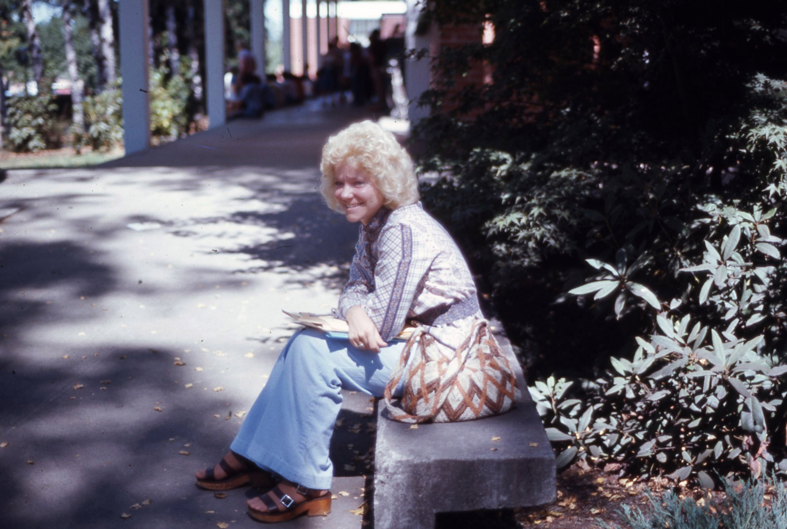 - A woman with blond hair holding several folders, sitting on the patio of Washburne Hall on the Pacific University campus. This photograph was taken by Peg Oslund. The original slide was printed in September, 1976.