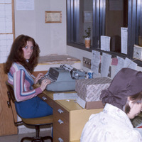 - Two women, possibly administrative staff or student workers, staffing a desk at Pacific University. One is using a typewriter while the other appears to be reviewing files. The original slide was printed in October, 1976.