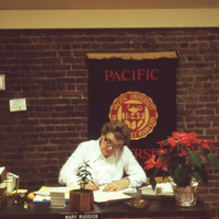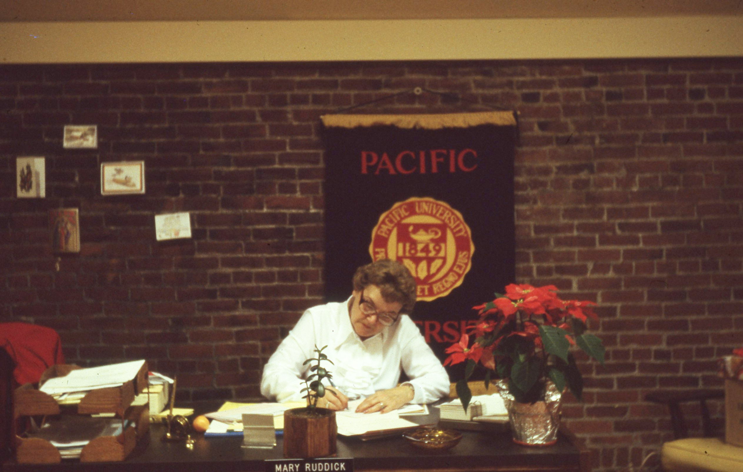 Mary Ruddick, Pacific University's alumni director, at her desk in Marsh Hall in Fall, 1977. The original slide is labeled, "C. Filer / M. R. Ruddick." Charlotte Filer, another member of Pacific's staff, was likely the photographer; she was Pacific's Public Information Officer. At the time that this photograph was taken, Marsh Hall had just reopened after a renovation, following a fire that had ruined the original interior in 1975. The original slide was printed in December, 1977.