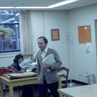A man, probably a professor, holding a stack of papers while passing by a woman who appears to be a department secretary. The man may be Professor Joe Story, who taught Economics. This photograph was taken in an office at Pacific University. The original slide was printed in February, 1978. For another view of the same woman, see: PUA_PeoSlides_256