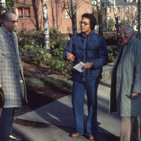 Professor Fred Scheller (left) with a student (center) and another man who is most likely Professor Albert "Hap" Hingston (right), on Pacific University's campus. Both Professors taught Speech and Communications at Pacific. Walter Hall appears behind them on the left; McCormick Hall is in the background. The original slide was printed in March 1978.