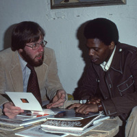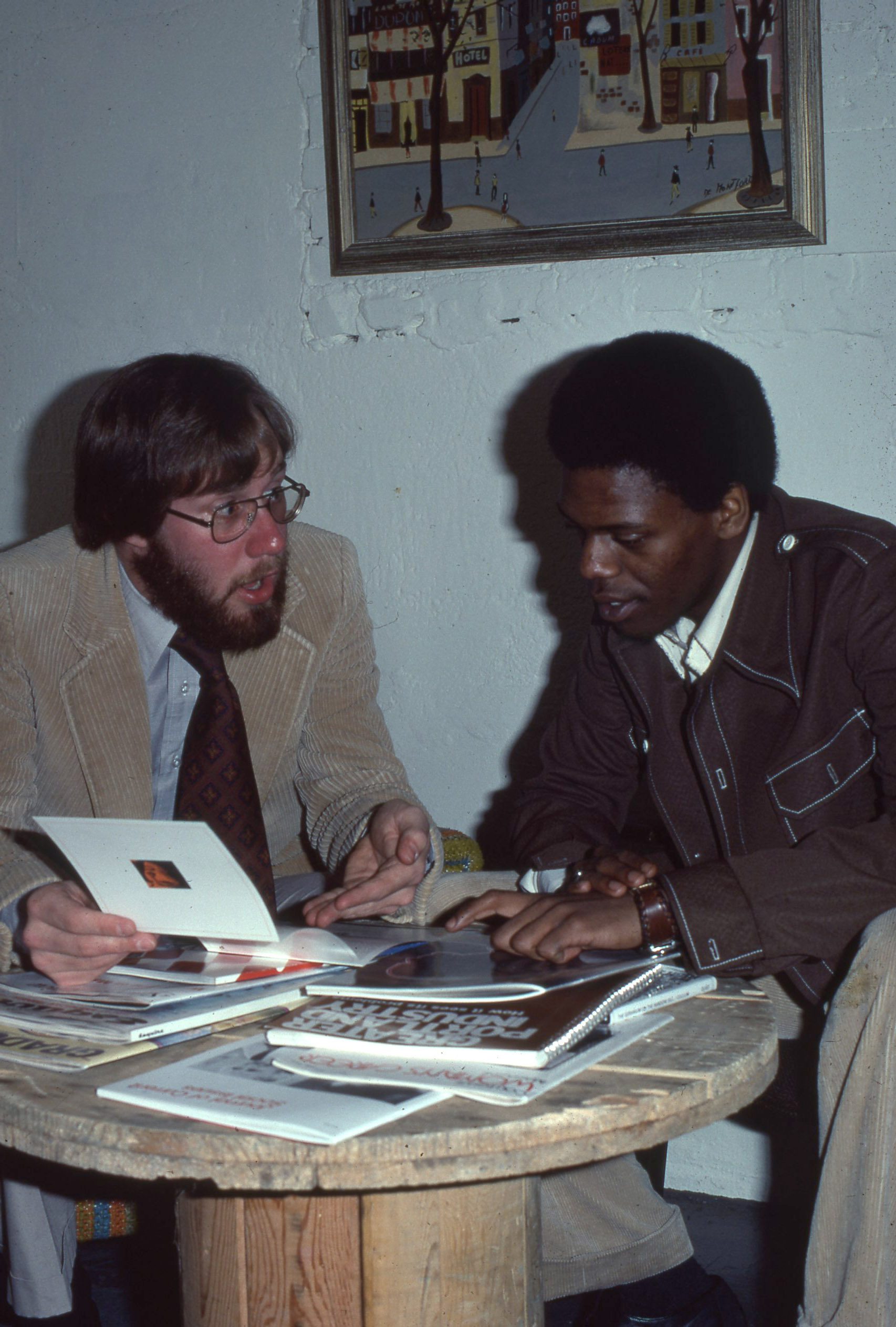 - A Pacific University student examining magazines with another man, presumably a Pacific University professor. The magazines appear to be on a variety of topics, including "Greater Portland Industry," "Esquire," and others. The original slide was printed in March 1978.