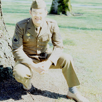 A man wearing a U.S. Army uniform with Sergeant First Class insignia, posing on what appears to be Pacific University's campus. He may have been a Pacific University alumnus. The original slide was printed in April 1978. This photograph was also printed in Pacific's 1977-78 yearbook at the beginning of the "Seniors Graduation" section.