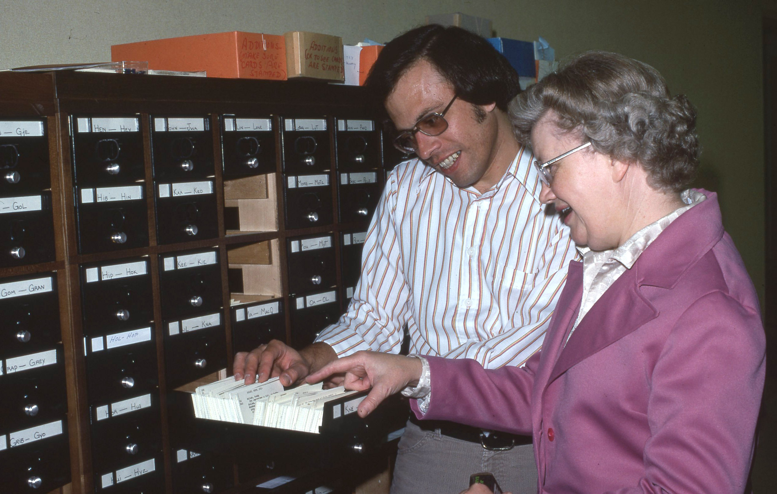 Alex Toth, who was a Librarian at Pacific University, and another Librarian (possibly Patricia Sobottka?), examining a card catalog in Pacific's Scott Library in July, 1978. This appears to be the Author catalog, which provided access to the books in Pacific's collections based on the last name of the author. This is one of a set of photographs that appears to have been posed in order to demonstrate the range of work that was taking place in the library.