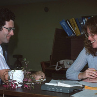 Two Pacific University librarians sitting in the staff area of Scott Library in July, 1978. Various papers are on the desk; library manuals, a rotary telephone and other items are on the shelves behind them. This is one of a set of photographs that appears to have been posed in order to demonstrate the range of work that was taking place in the library.