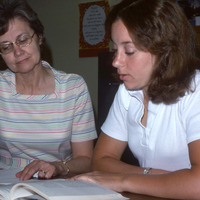 - A Pacific University librarian (possibly Mary Ann Mellbye?) assisting a young woman, probably a Pacific University student, with a book in Scott Library in July, 1978. This is one of a set of photographs that appears to have been posed in order to demonstrate the range of work that was taking place in the library.