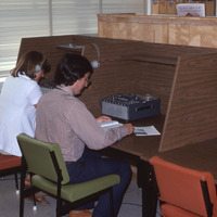 - Two people, possibly Pacific University students or staff, listening to reel-to-reel recordings in Scott Library in July, 1978. This is one of a set of photographs that appears to have been posed in order to demonstrate the range of work that was taking place in the library.