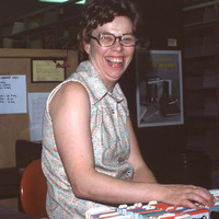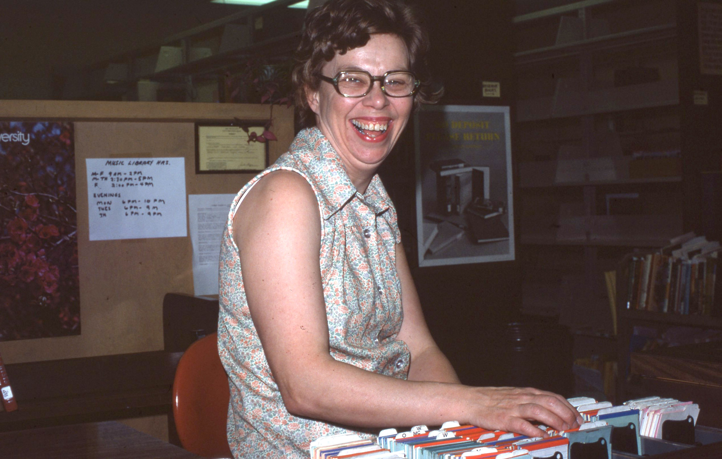 - A Pacific University librarian (possibly Helen Dugdale), laughing at the camera while she works with a set of index cards. This was taken in Scott Library in July, 1978. This is one of a set of photographs that appears to have been posed in order to demonstrate the range of work that was taking place in the library.