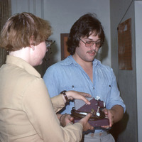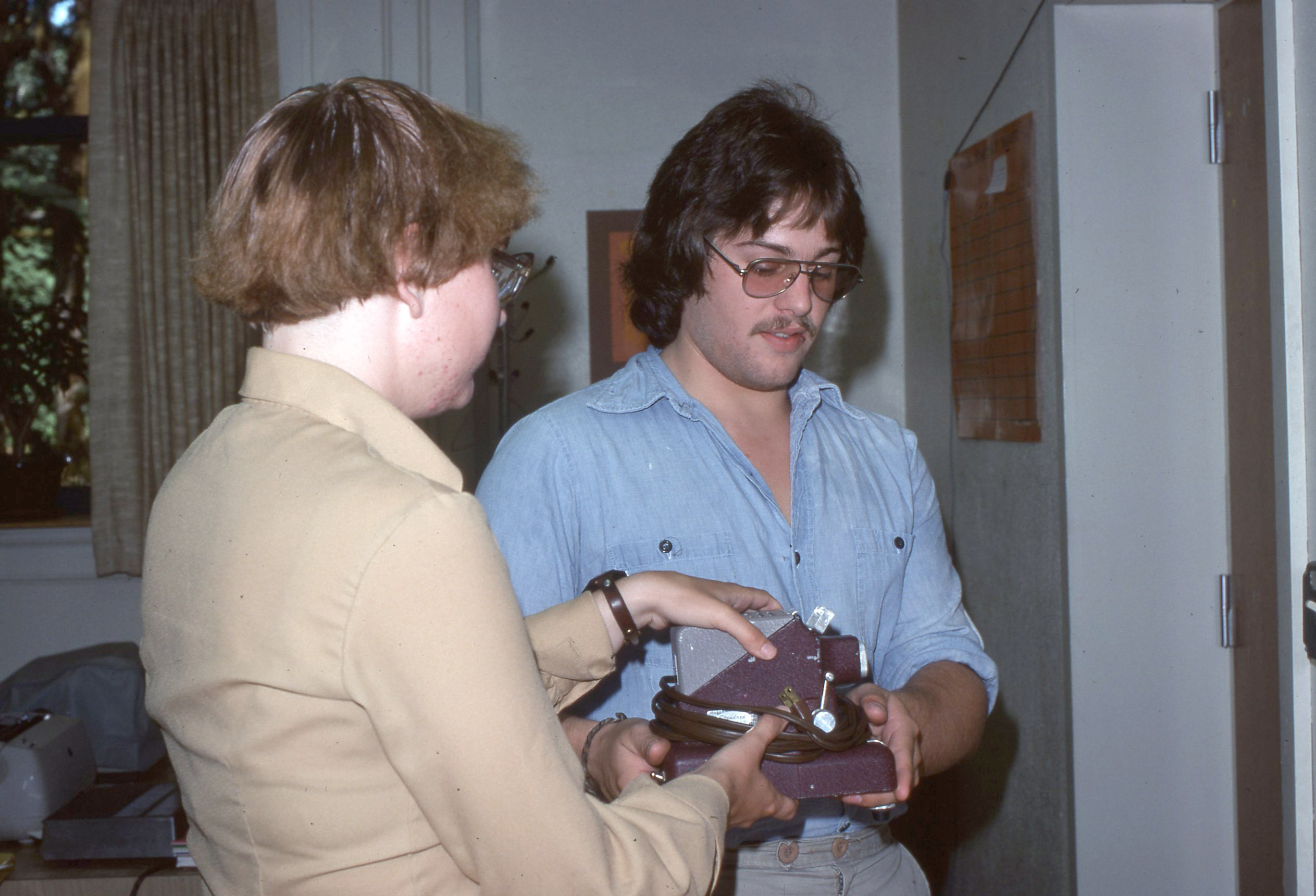 Two people, probably Pacific University students or staff working for the university's AV department, moving a piece of equipment in July, 1978. The equipment is small but apparently heavy; it may be a projector or another audio-visual machine. This is one of a set of photographs that appears to have been posed in order to demonstrate the range of work that was taking place in the audio-visual department of Pacific University.