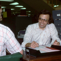 - Librarian Alex Toth assisting a patron in Pacific University's Scott Library in July, 1978. This was likely taken in the Reference area of the library. This is one of a set of photographs that appears to have been posed in order to demonstrate the range of work that was taking place in the library.